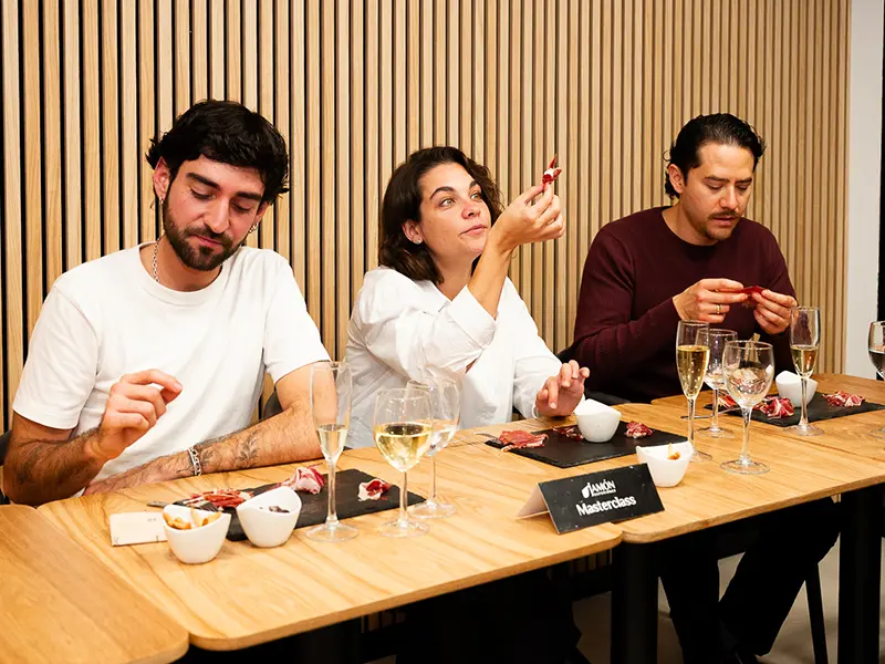 Move into the top tier with cubes and slices of 50% Ibérico Bellota paired with sparkling cava. Your Jamón Master reveals how bubbles cleanse your palate between bites, allowing you to appreciate subtle flavor shifts across cuts and curing styles. -