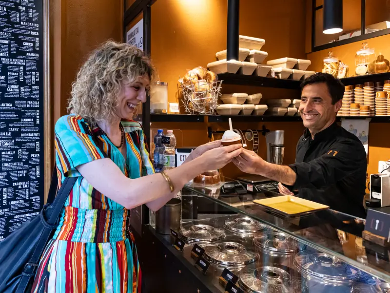 Guest receiving a glass of wine through a historic wine window set into a stone wall Guest holding a glass of prosecco while standing in a sunny Italian piazza Platter of sliced Italian cured meats, cheeses, and bread served during a food tasting Local shopkeeper holding a cured pork leg inside a traditional Italian deli Glasses of red Italian aperitivo lined up on a marble bar counter Chef serving freshly made gnocchi to guests seated at a table during a cooking class Guest receiving a cup of Italian gelato from a server behind the counter in a gelateria