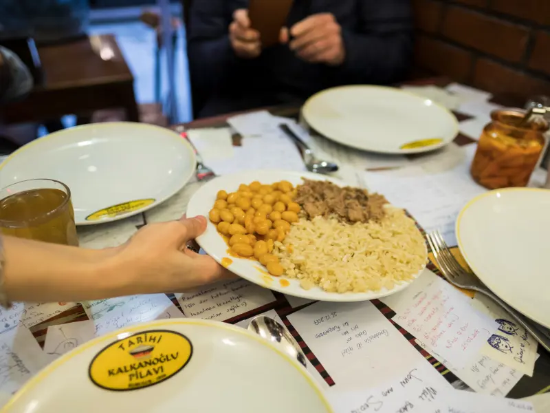 Next, step into a modest eatery where fluffy pilav (Turkish rice) and hearty kuru fasulye (white bean stew) are made from a recipe passed down through generations of Ottoman palace cooks. Each spoonful carries the soul of centuries-old Turkish cooking, prepared exactly as it was for sultans. -