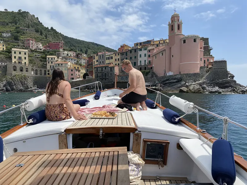 Group of guests seated on the bow of a boat facing colorful harbor buildings along the coast Classic wooden boat moored in a marina with other boats and hills in the background Guest relaxing on the bow of a boat near rocky coves and green coastal cliffs Two guests seated on the bow of a boat with Vernazza’s church and waterfront behind them Coastal view of pastel-colored buildings perched on cliffs above turquoise water in Cinque Terre Traditional wooden boat docked at a stone pier inside a quiet marina