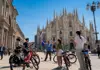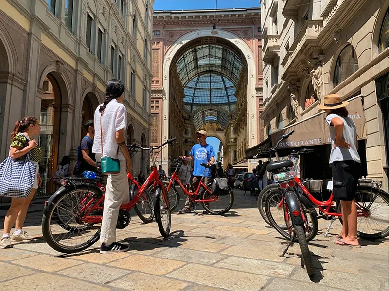 Pedal toward the Piazza del Duomo to view the massive gothic masterpiece that took nearly six centuries to complete. You will learn about the 3,400 statues adorning the facade and the significance of the golden Madonnina, the beloved statue of the Virgin Mary perched atop the highest spire.