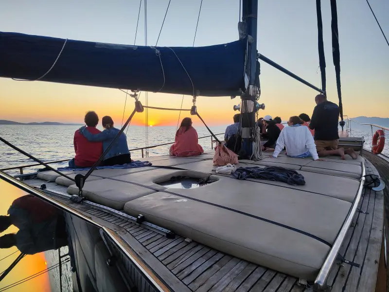 Depending on group size, you’ll be on either Andreas (89ft, up to 40 people) or Atlantis (72ft, up to 30 people). Both are wide, comfy, and have plenty of space to stretch out and relax.
