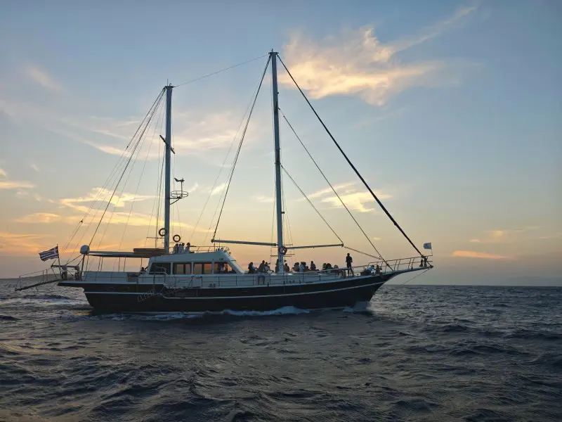 You greet your guide and crew on the pier for check-in and a short safety briefing. Boarding the yacht sets the tone for a relaxed cruise as you leave Mykonos behind and cross the Aegean toward the central Cyclades. -