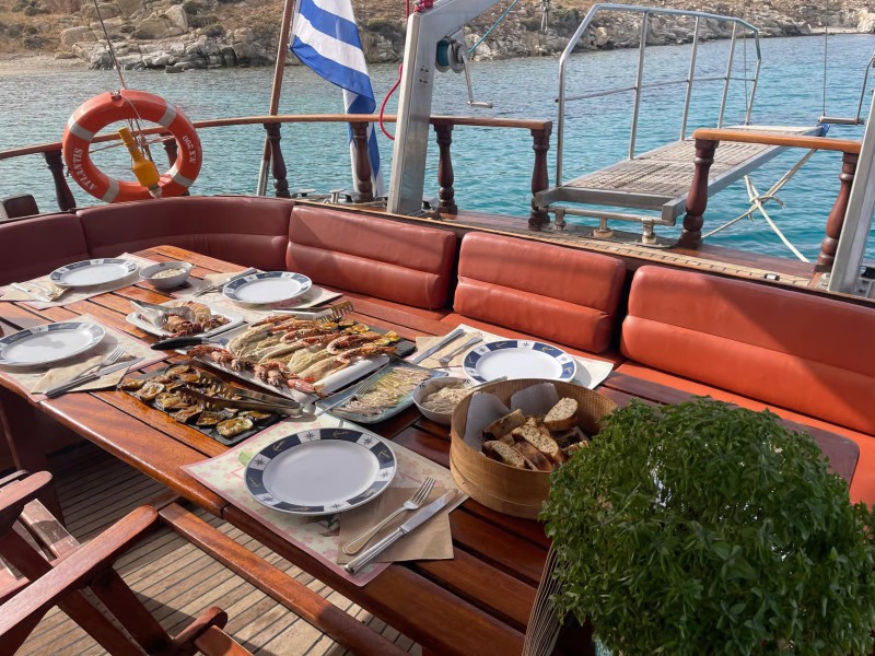 Savor a delicious traditional Greek snack with a selection of drinks while enjoying the open sea views from the deck. -