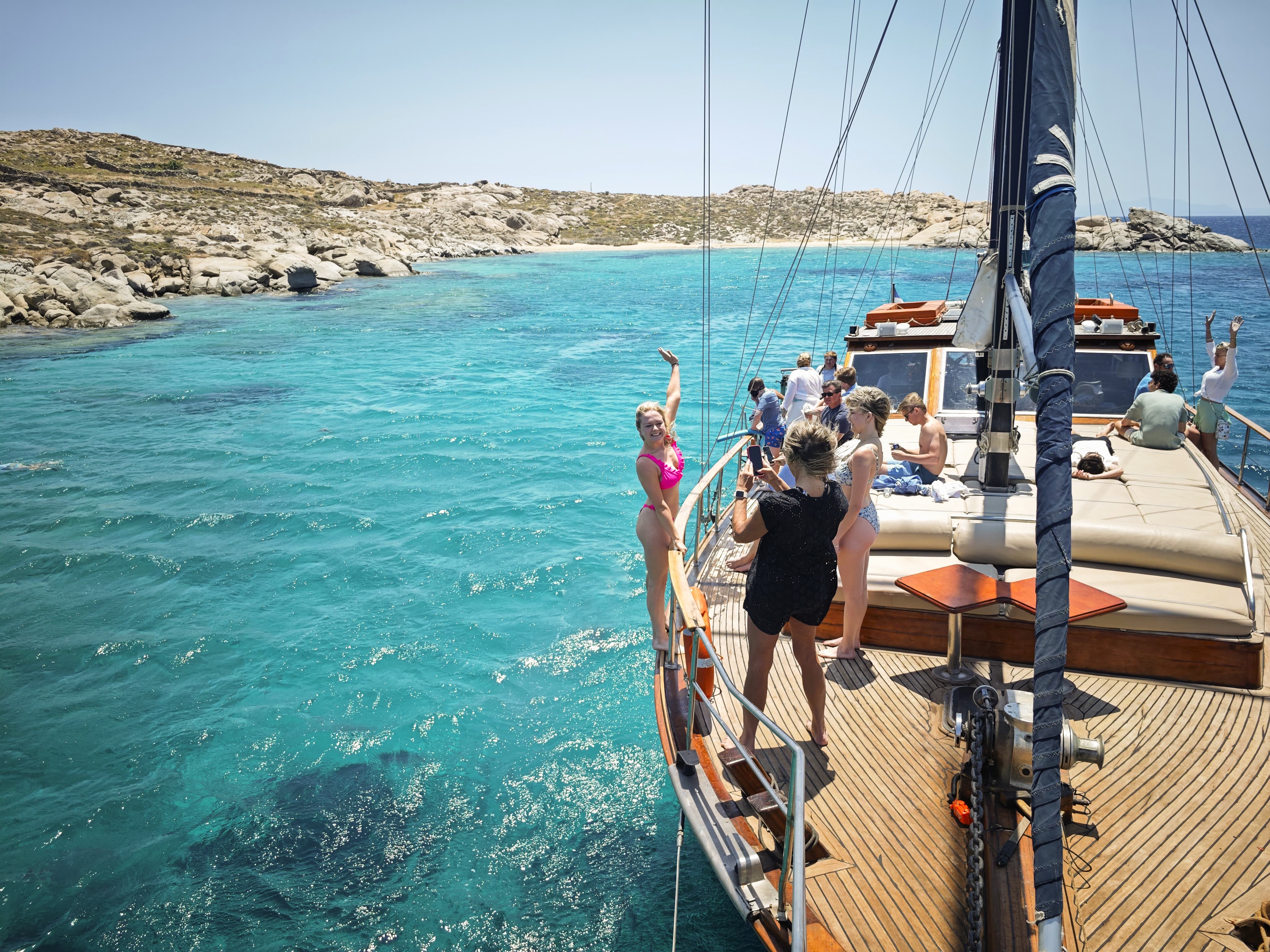 Sail along Mykonos’ famous beaches: Super Paradise, Paraga, Elia, and Psarou