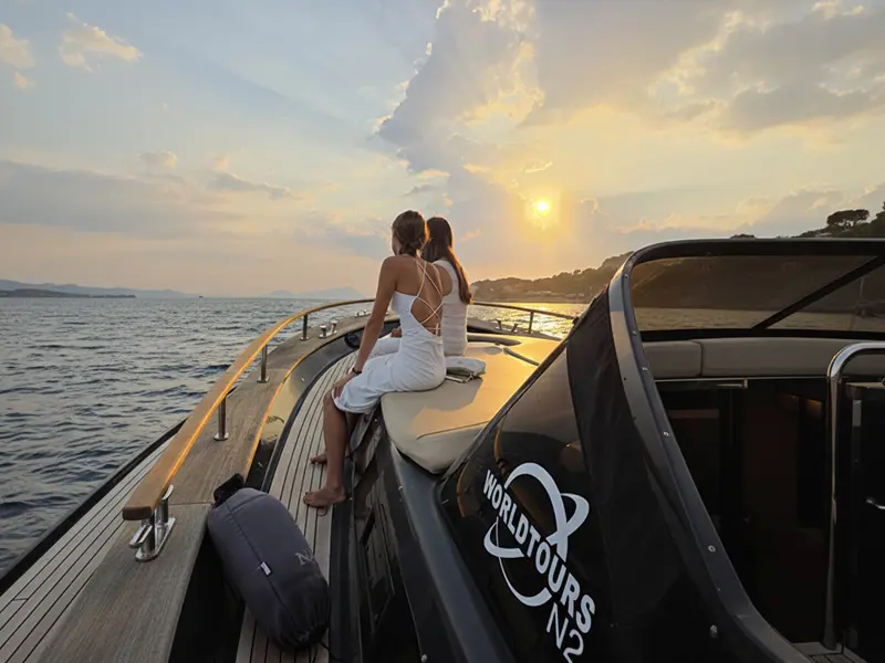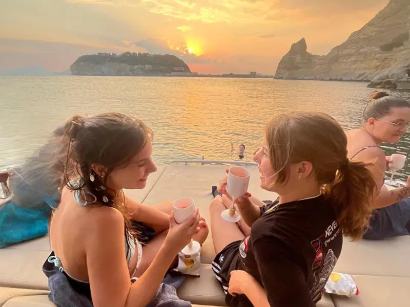 Relax on deck as the sky shifts into shades of pink and gold with a drink in hand. This quiet moment allows for perfect photos of the Vesuvius silhouette across the calm Neapolitan waters. -
