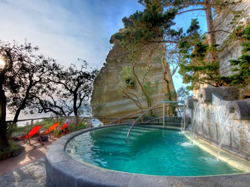 Enjoy the scenic, hour-long ride across the glistening Gulf of Naples, keeping an eye out for Capri and Mount Vesuvius as you cruise to wellness. -