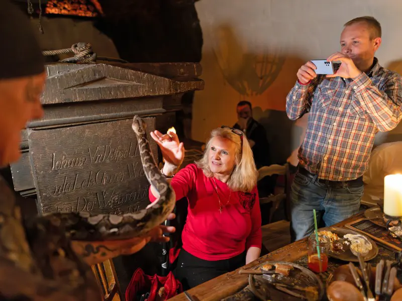 The evening concludes at the famous Medieval Tavern, where an authentic feast awaits. You'll eat to your heart's content while enjoying unlimited consumption of Dětenice beer and Moravian wine. Prepare to be entertained by a live medieval show featuring artists, beautiful dancers, jugglers, and a fakir with a snake. As the grand finale, you'll be enchanted by a magnificent fire show that proves that these guys really knew how to party.