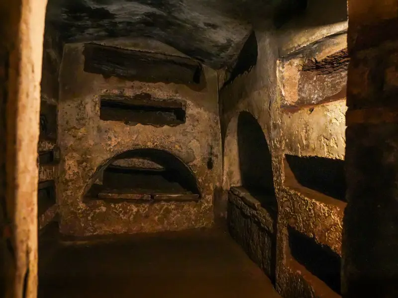 Deeper inside, you see small chapels, carved niches, and faded frescoes that hint at the hopes of the people buried here. You learn how symbols like fish and anchors helped early Christians mark their faith in a dangerous era. -