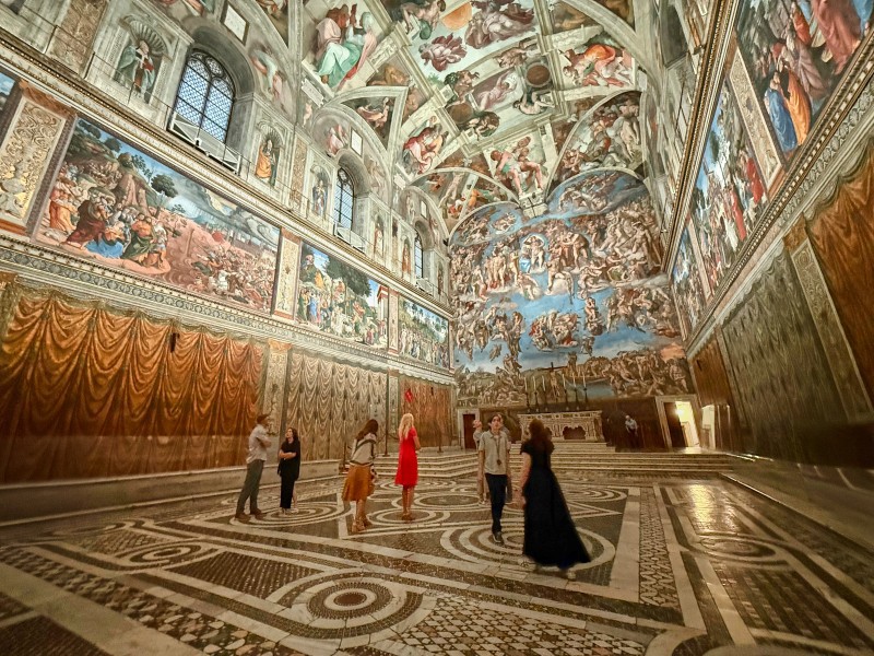 Once inside, the magnitude of Michelangelo’s masterpiece becomes clear. In just four years, he painted over 600 figures across the ceiling and altar wall—scenes from Genesis, prophets, sibyls, and the powerful Last Judgment. The Sistine Chapel is not only a breathtaking artistic achievement, but also the place where cardinals gather to elect a new pope, deepening its spiritual and cultural significance.