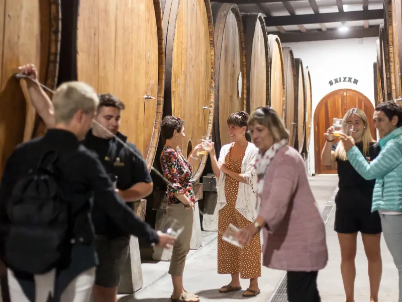 Enter the cellar to experience the ritual of drinking directly from the barrel. You will learn how to catch the cider in your glass to aerate the liquid, enjoying a small pintxo snack as you sample different vintages from the massive wooden kupelas(barrels).