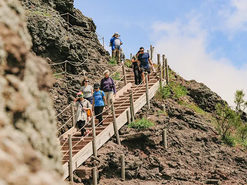This is an active day with extensive walking. You'll spend around two hours exploring Pompeii on foot over uneven ancient surfaces, plus a 30-minute uphill hike to the crater's edge of Mt. Vesuvius on volcanic terrain. Sturdy, comfortable walking shoes are essential.